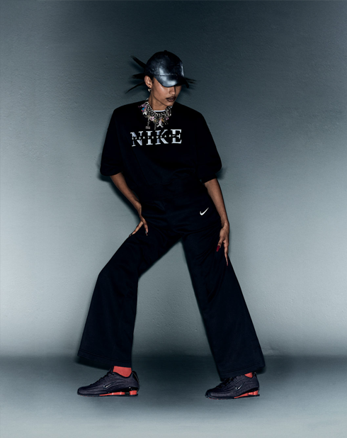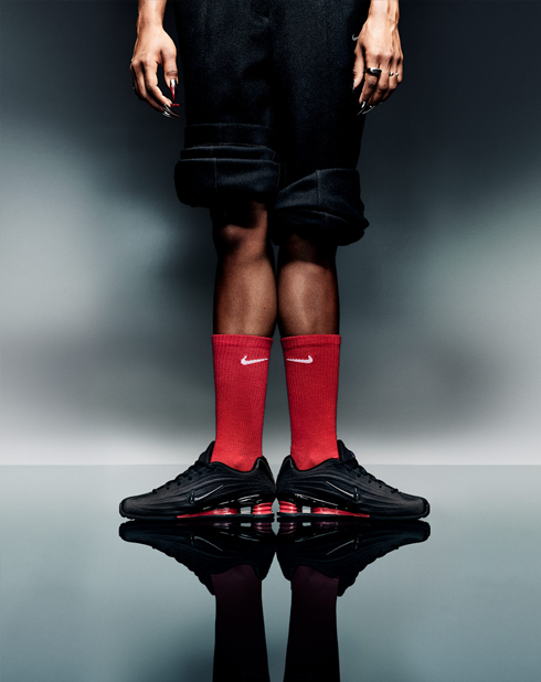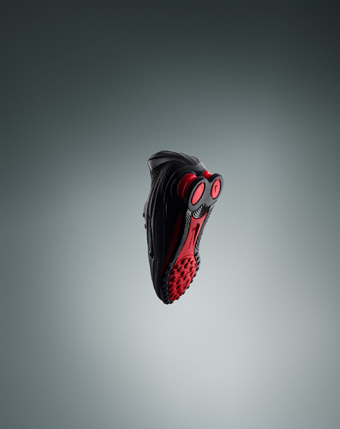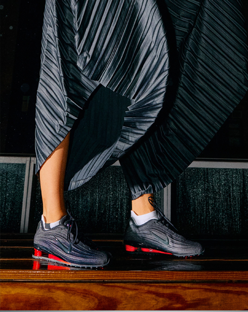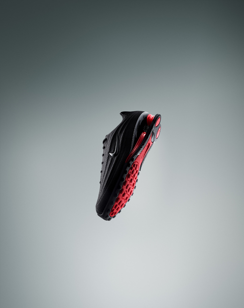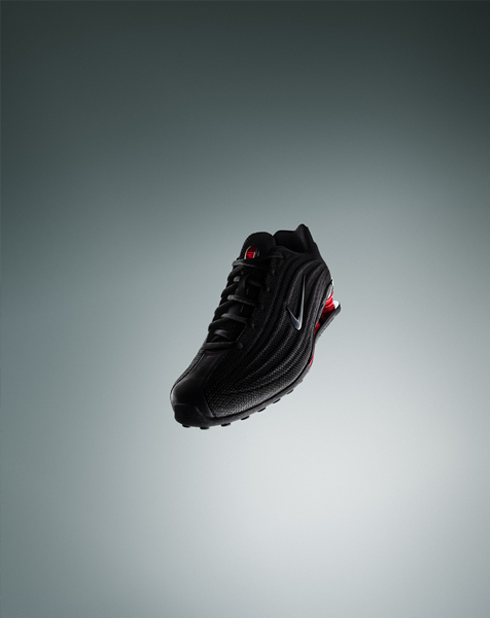The jet black upper of this gracefully streamlined Shox Z sneaker generates a powerful aesthetic as its sleek sidewall Swooshes feature a shiny finish to match that of the mechanical cushioning system supporting the heel. Here, the first vibrant flashes of University Red can be seen highlighting the Shox pillars, with the eye-catching tone also spreading across much of the outsole, where it contrasts a thick black perimeter. Fine University Red accents deliver a delicate touch of colour to the classy mesh upper, firstly through the tiny forefoot Swoosh, and then via the bright Nike Shox logo shining out from within the bulbous tongue bubble of this captivating dichromatic colourway.